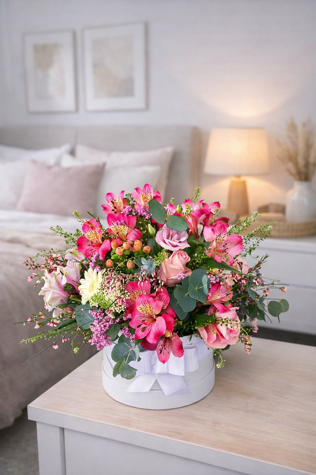 Květinový box v papírovém obalu přizdobený zelení a stuhou